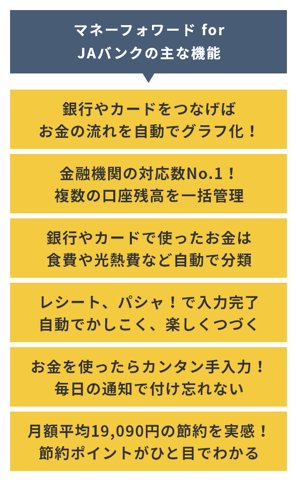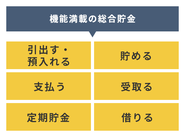 JAの総合口座は「引出す・預入れる」の基本機能に加え、給与や年金の「受取り」、公共料金などの自動引落しといった「支払い」、毎月決まった日に普通貯金から定期積金に振替えて確実に「貯める」など便利な機能満載です。