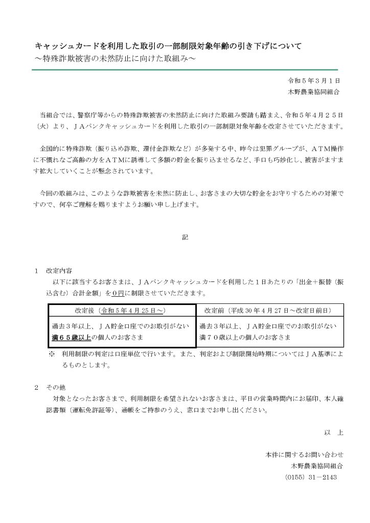 キャッシュカードを利用した取引の一部制限対象年齢の引き下げについて